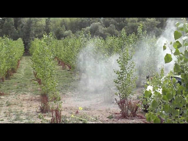 CAÑON PULVERIZADOR TRATANDO CHOPOS DE 25 METROS