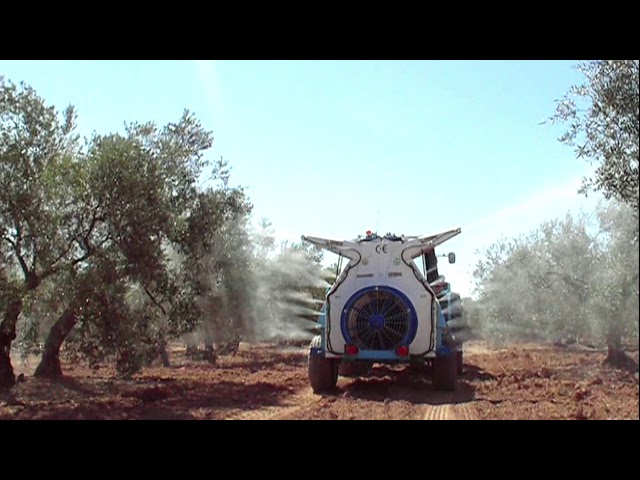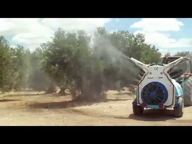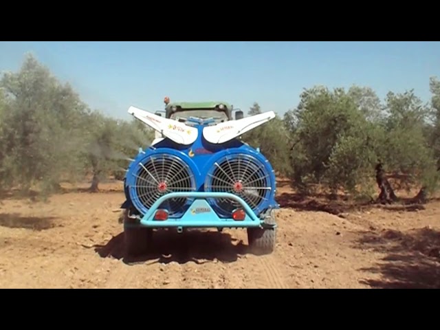Pulverizador Nebulizador tratando 2 filas completas de olivo superintensivo